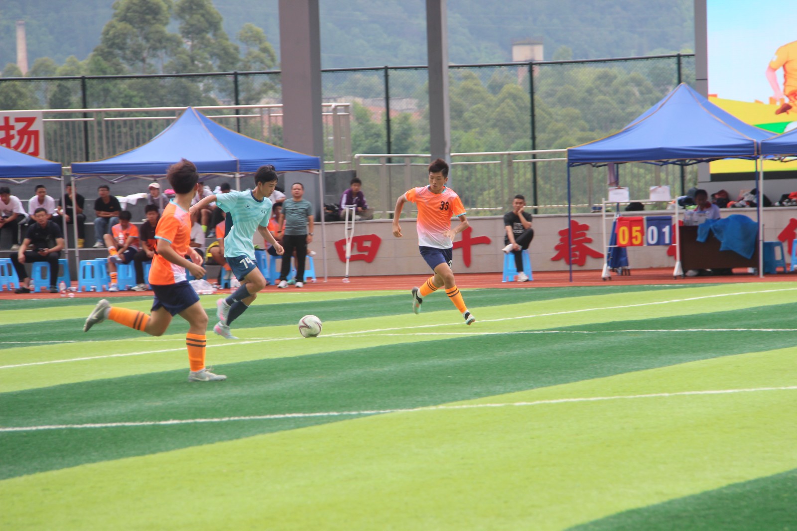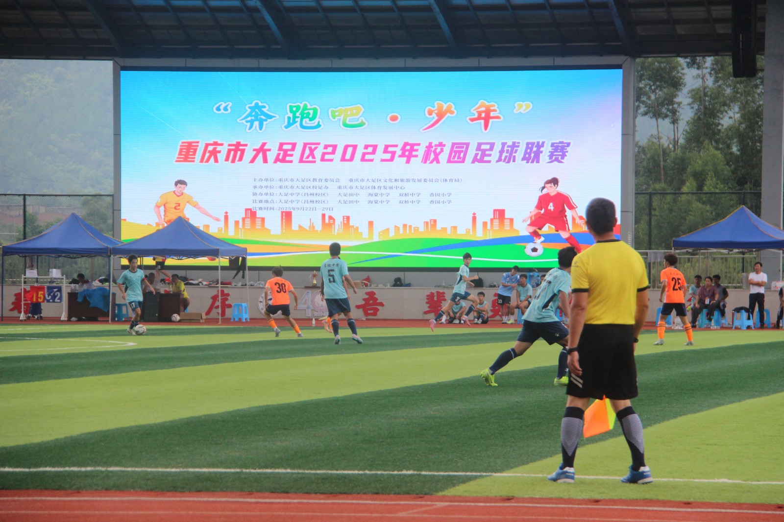 当日 14:00,双桥中学与大足二中的冠军对决准时开赛。作为国家级足球特色学校培养的队伍,双桥中学球员开场即展现专业素养:仅 9 分钟,前锋线凭借平日打磨的默契配合连入两球,瞬间点燃赛场氛围。观众席上,双桥中学啦啦队挥舞校旗高喊“桥中必胜”,助威声与球员的攻防节奏形成共振。