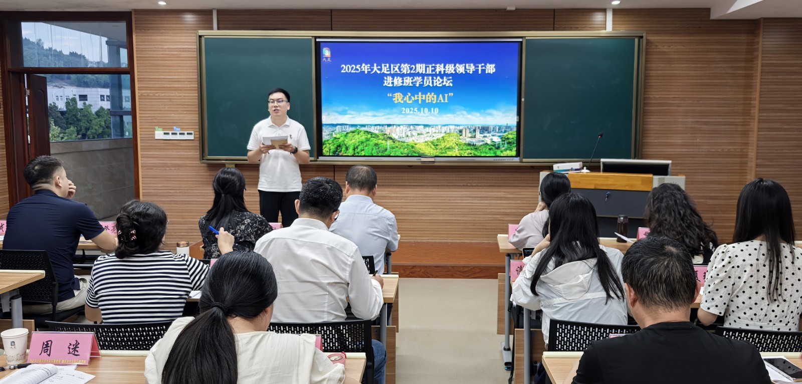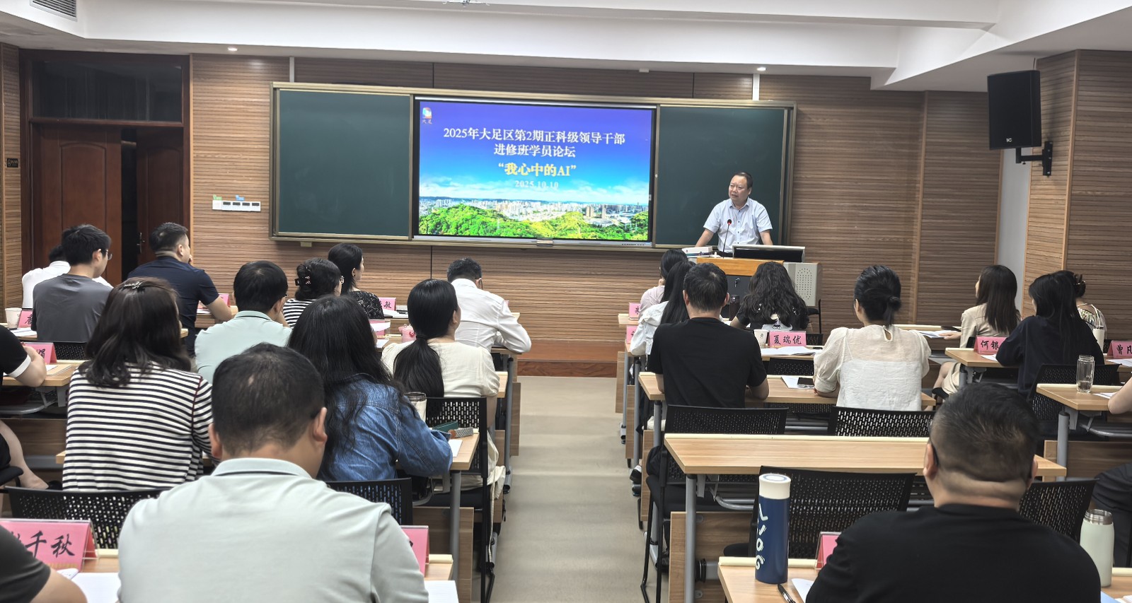 10月10日晚,大足区2025年第二批正科级干部进修班“学员论坛”第一期火热开讲。本次论坛以“我心中的AI”为主题,8名来自镇街、部门一线的学员代表轮番登台,结合工作实际晒案例、谈体会、话未来,在思维碰撞中勾勒“AI+基层治理”新图景。区委党校常务副校长郭联胜现场点评,近60名师生共享这场“数智盛宴”。