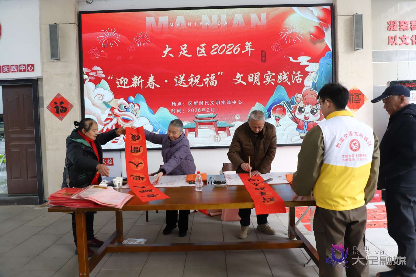 过大年,沐浴文明新风。2月11日,大足区委宣传部开展“我们的节日·春节”新时代文明实践活动,创文志愿者和社区居民约100人参加“我在新时代文明实践中心过大年”主题活动,一起联欢过年。