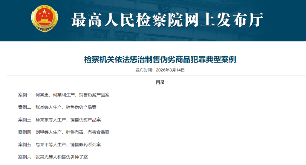 最高检3月14日发布6件检察机关依法惩治制售伪劣商品犯罪典型案例,涉及生产、销售有毒、有害食品等,与人民群众的生命健康、财产安全息息相关。