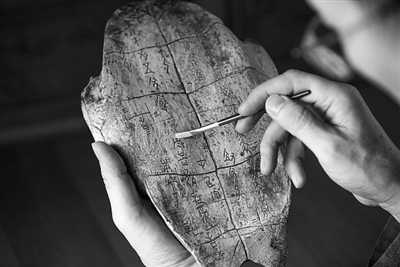 考古工作者拿刷子清理甲骨文上的泥沙 (视觉中国供图)
